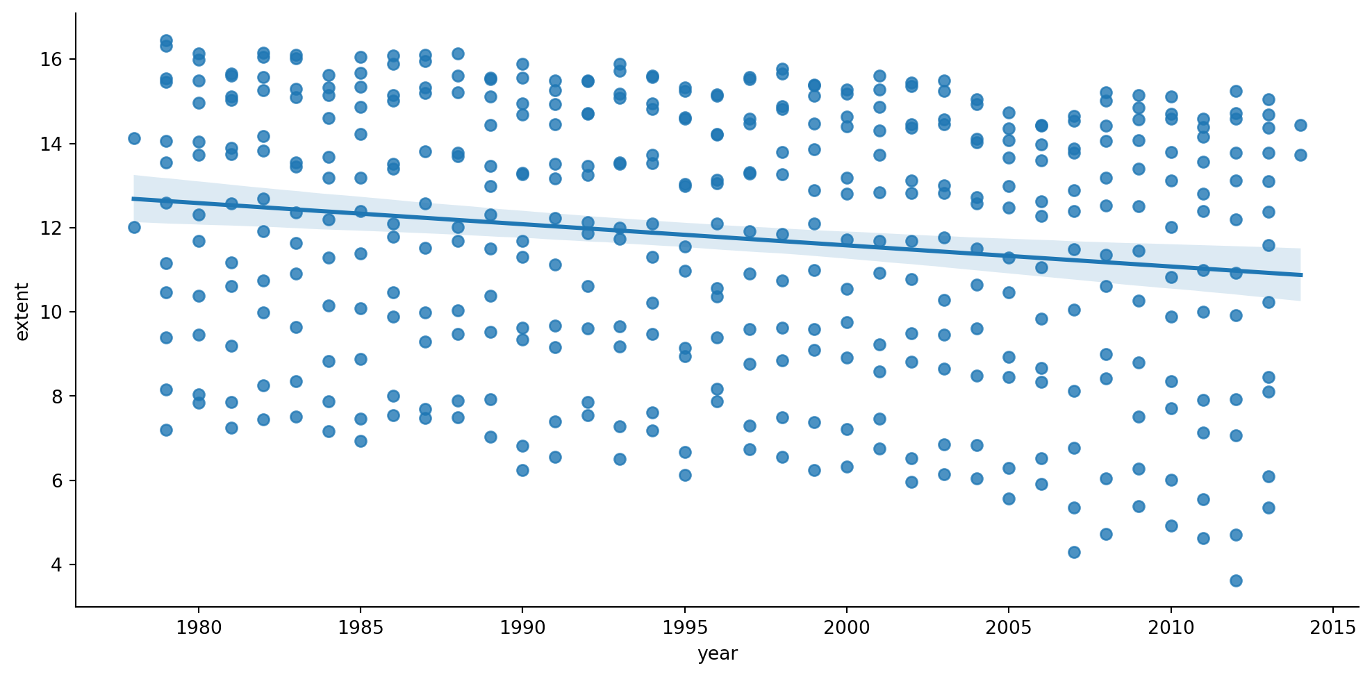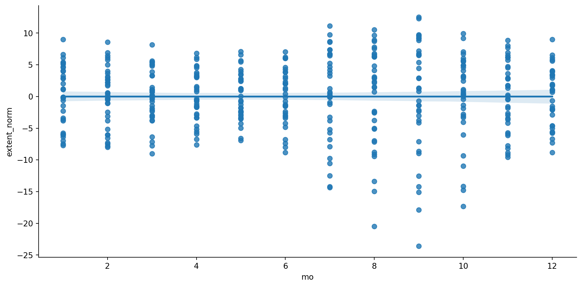 Now that we have a clean dataset, we can use Seaborn’s lmplot() function comparing month vs extent.