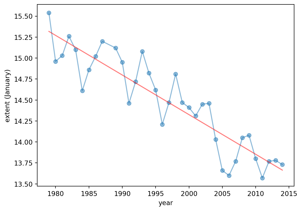 # analysis for a particular month.# for Januaryjan = ice2[ice2.mo ==1];x = jan[['year']]y = jan[['extent']]model = LinearRegression()model.fit(x, y)y_hat = model.predict(x)plt.figure()plt.plot(x, y,'-o', alpha =0.5)plt.plot(x, y_hat, 'r', alpha =0.5)plt.xlabel('year')plt.ylabel('extent (January)')print ("MSE:", metrics.mean_squared_error(y, y_hat))print ("R^2:", metrics.r2_score( y, y_hat))