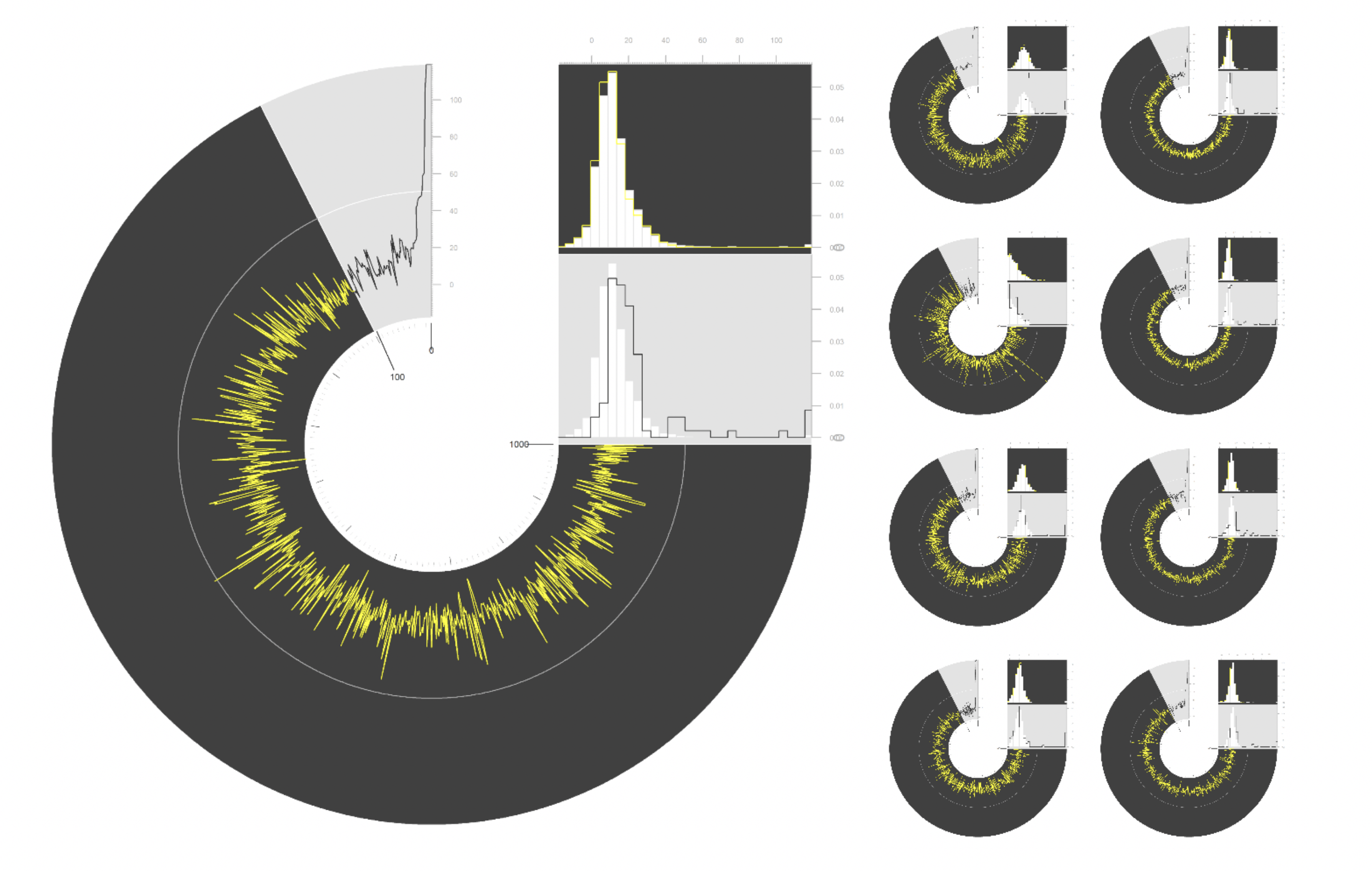 x <- plot_spiral_stream(x)This plot shows the chain and summary histograms in a format that can be easily arranged as a grid. The trace plot is stretched, clearly indicating ‘burn-in’, with density plots showing the burn-in and remainder of the chain in context.