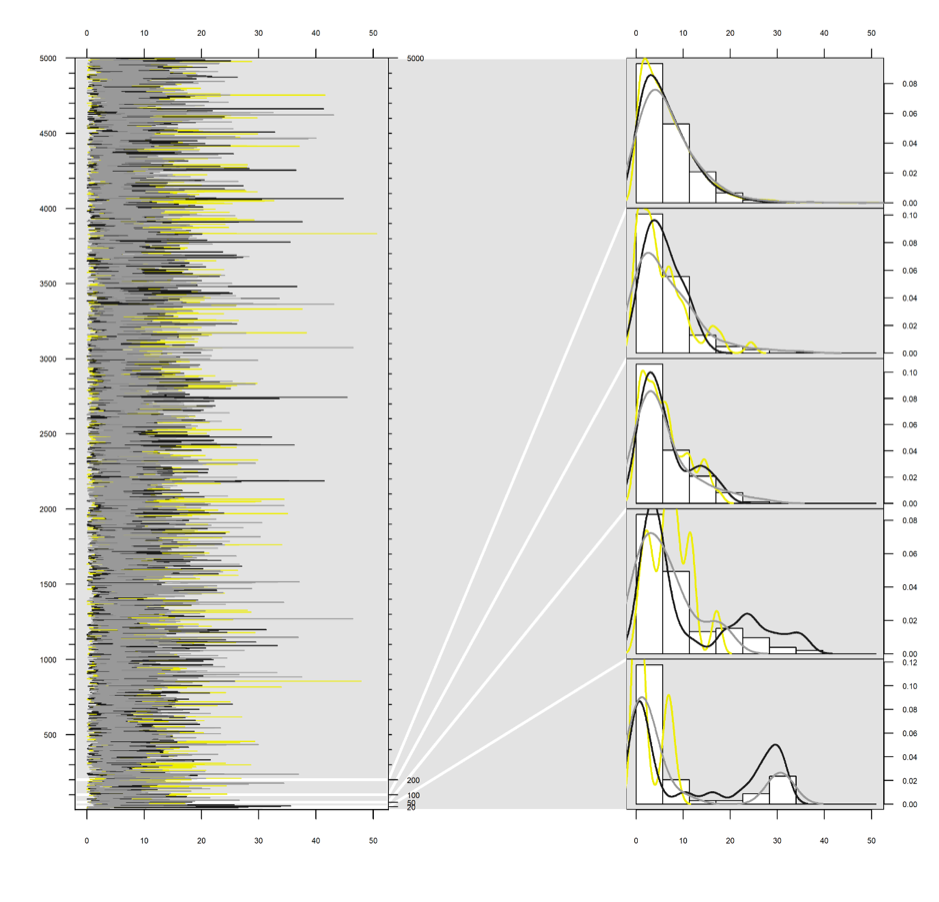 By partitioning chain slices, in a faceted view, users can assess chain convergence. The slices are currently specified by the user and display density plots for each slice. Have my chains converged? The slice plot offers a clear view of when and how convergence is achieved. Further statistical diagnostics can be embedded in these plots as colour encodings or additional layers and annotations.