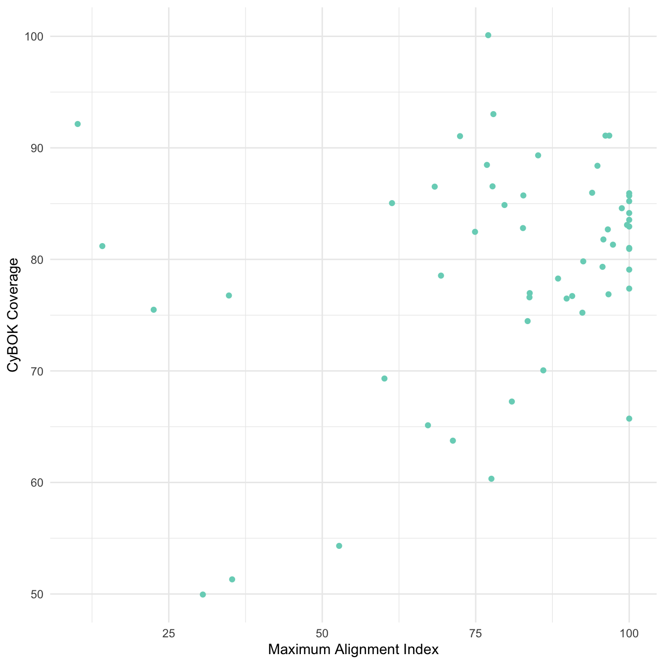 The figure below shows on the x axis each respondent’s maximum alignment score, plotted against (on the y axis) the fraction of their comb that is covered by CyBOK. There is no significant correlation gives us confidence that the inclusion of our additional categories was not significantly skewing the personal alignment metric results.