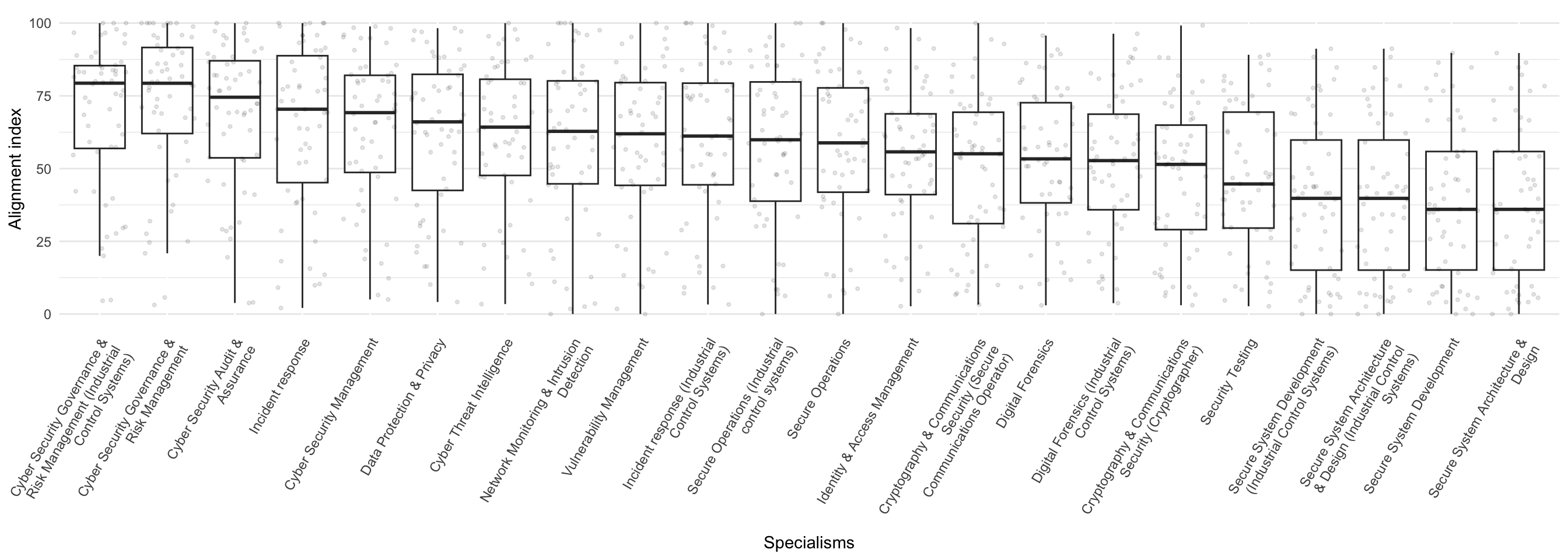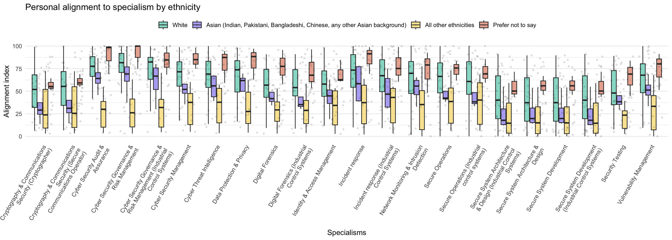 The visualisation below shows an overall view of how our respondents aligned with the UKCSC specialisms. The variance was relatively modest, with the highest average alignment roughly double that of the lowest average alignment. Looking at the individual boxplots, we note that our sample spanned a wide range, including respondents that scored very highly and very low in each area.