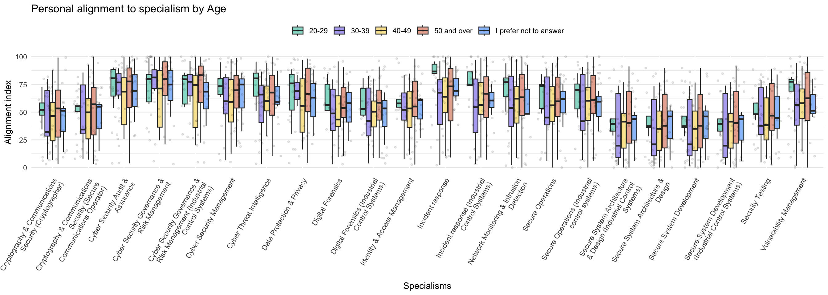 The same view but broken down by age shows that, interestingly, in our sample younger respondents were not less well aligned than older respondents. This could reflect the fact that younger cyber security professionals may have studied degrees relating to cyber security that did not exist when older respondents were students (degrees that have syllabuses that aim at comprehensive coverage). Understanding this view from a larger dataset would be illuminating about how the profile of the profession is changing.