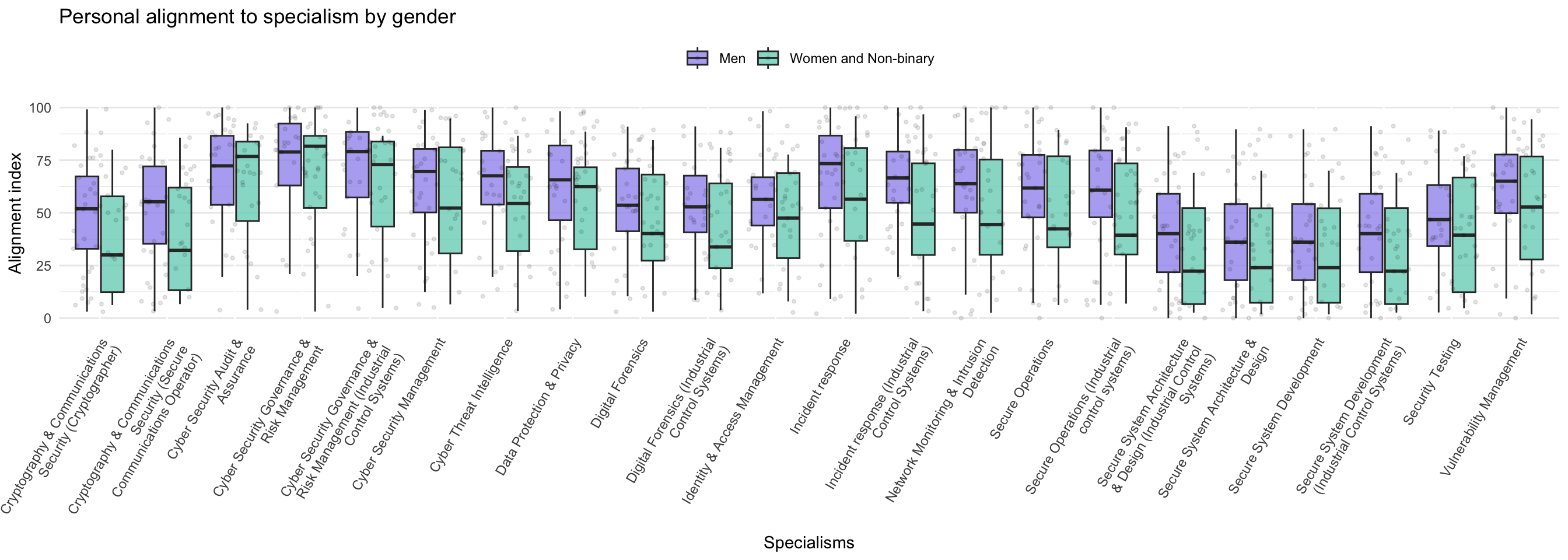 More research is needed to disambiguate these factors, and to build a dataset that would allow us to control for factors such as years of experience. In our recommendations we call for further Decrypting Diversity studies that could address this gap. In parallel with this, any specialisms that are likely to help to rebalance professional recognition in these direction should be developed. Two examples are security human factors and security awareness. Understanding what specialisms like these could look like could help future analysis to investigate the implications for inclusivity of possible future adjustments to the Cyber Careers Framework.