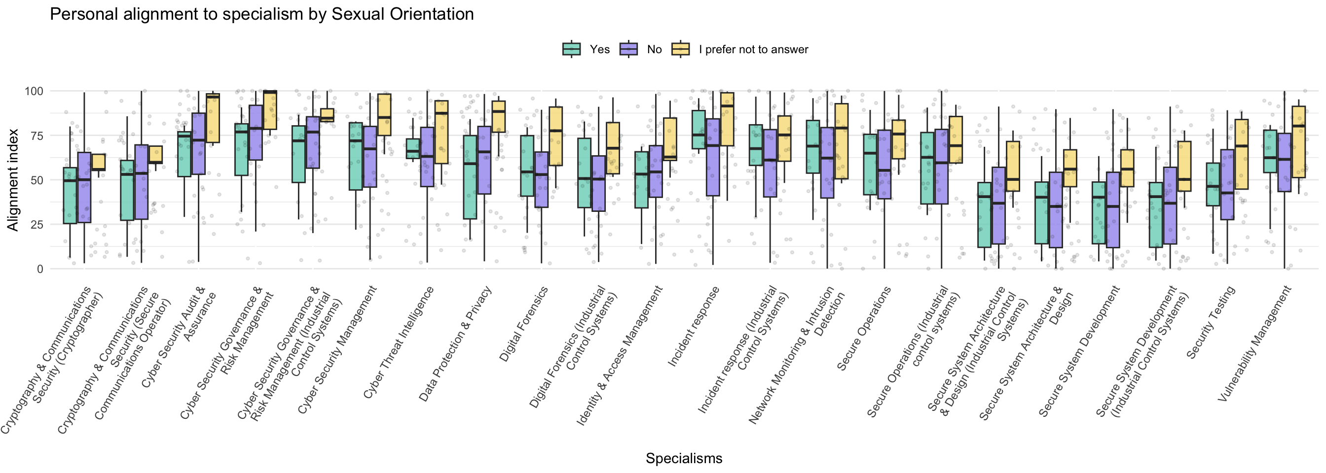 Our study shows encouraging indicative results that sexual orientation does not significantly map on to differences in alignment with specialisms.