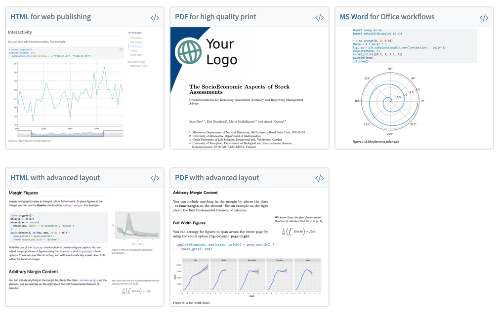 .ipynb/Jupyter notebook) OR plain text files (.qmd,.rmd,.md) into different outputs (reports, books, websites, presentations…) , which can be in different formats (PDF/Word/HTML…) .